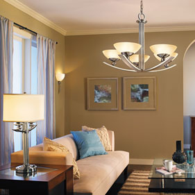 livingroom-lgTo meet the varied needs of a living room or family room – entertaining, watching television, reading, playing games, accenting artwork – three to four layers of lighting should be used. These might include recessed lighting around the perimeter of the room, a chandelier or central decorative fixture for general lighting, wall sconces for mood and portable lamps for reading and other tasks. Use dimmers whenever possible for maximum control of all fixtures.